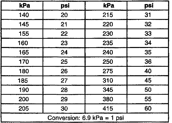 The Kilopascal (kPa) is the metric term for pressure. The tire pressure may be printed in both Kilopascal (kPa) and psi. One psi equals 6.9 kPa.