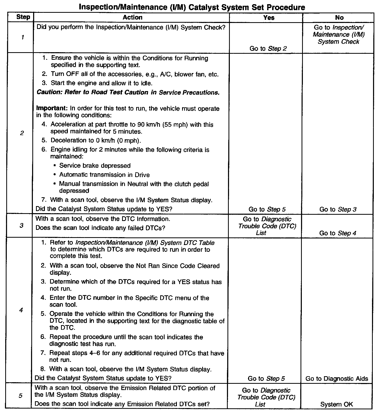 DESCRIPTIONThe purpose of this test is to satisfy the enable criteria necessary to execute I/M readiness diagnostics for the catalyst system. The test may be used to set the I/M System Status indicators to YES. Ensure the vehicle meets the requirements listed in Conditions for Running before performing this test. Failure to meet the necessary requirements may produce inaccurate test results.
