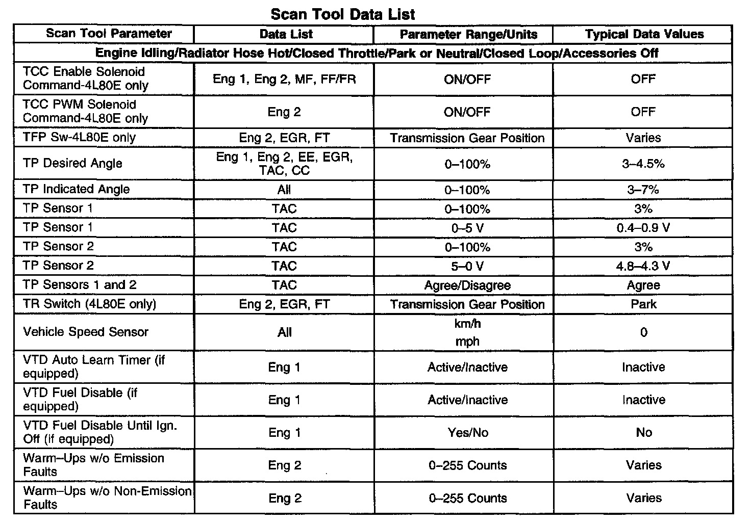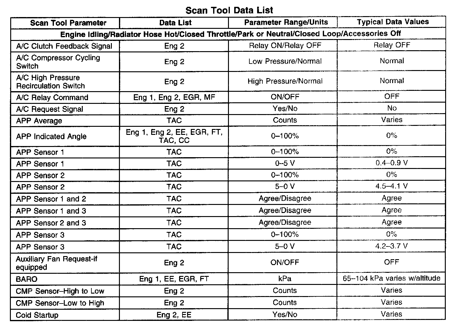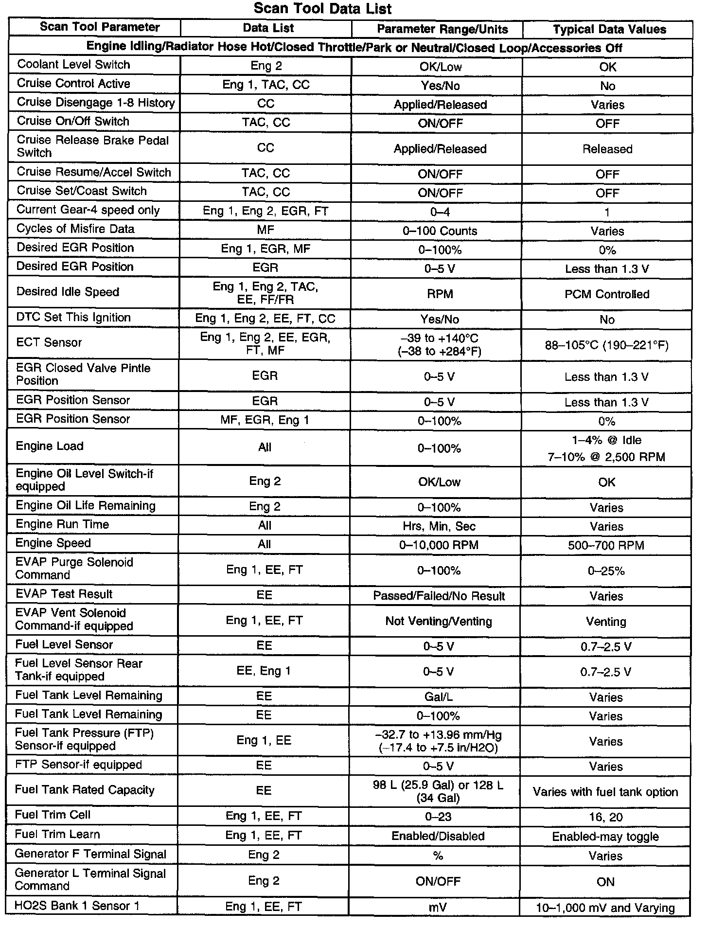 The Engine Scan Tool Data List contains all engine related parameters that are available on the scan tool. The list is arranged in alphabetical order. A given parameter may appear in any one of the data lists, and in some cases may appear more than once, or in more than one data list in order to group certain related parameters together.