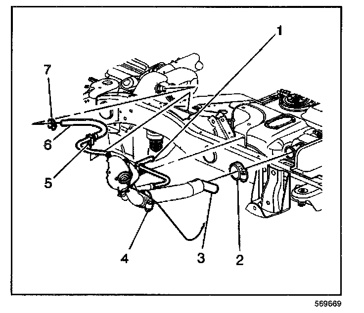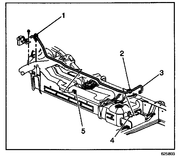 5. Disconnect the EVAP vent pipe (3) at the fuel tank clip (5).
