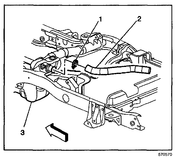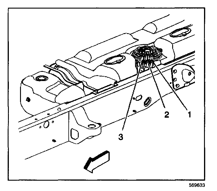 14. Disconnect the fuel feed, return, and EVAP pipes (1, 2, 3) at the fuel sender.