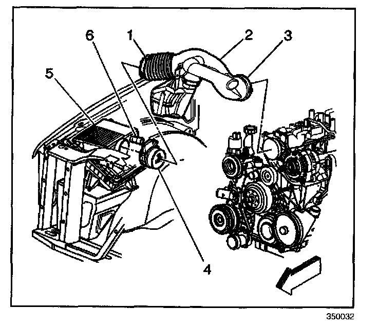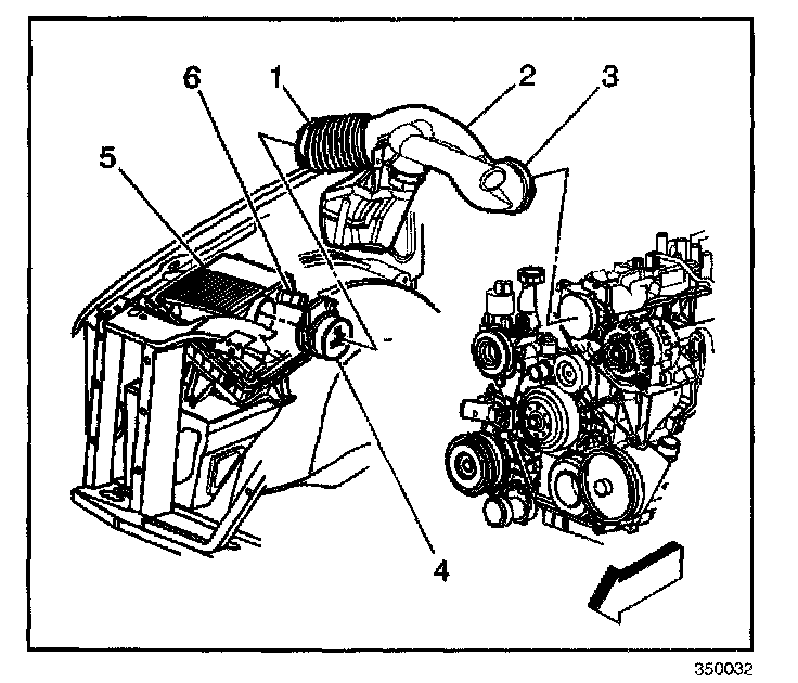 1. Loosen the clamps on the air intake duct (2) at the throttle body (3) and at the mass air flow/intake air temperature (MAF/IAT) sensor (1).