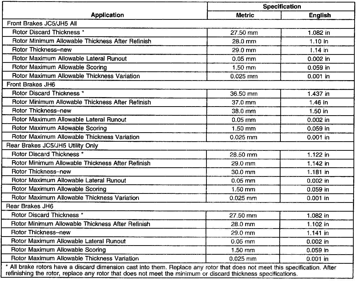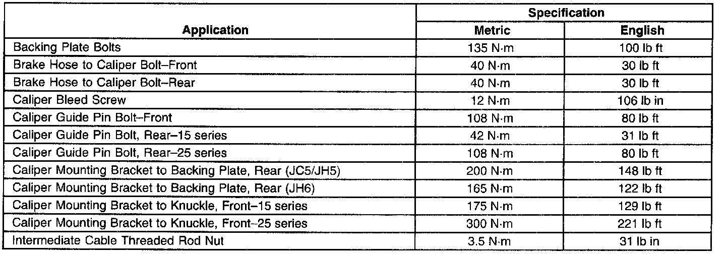 Disc Brake Component Specifications: