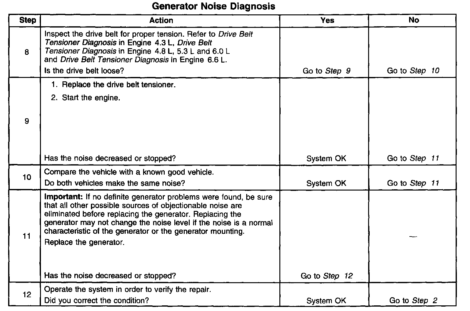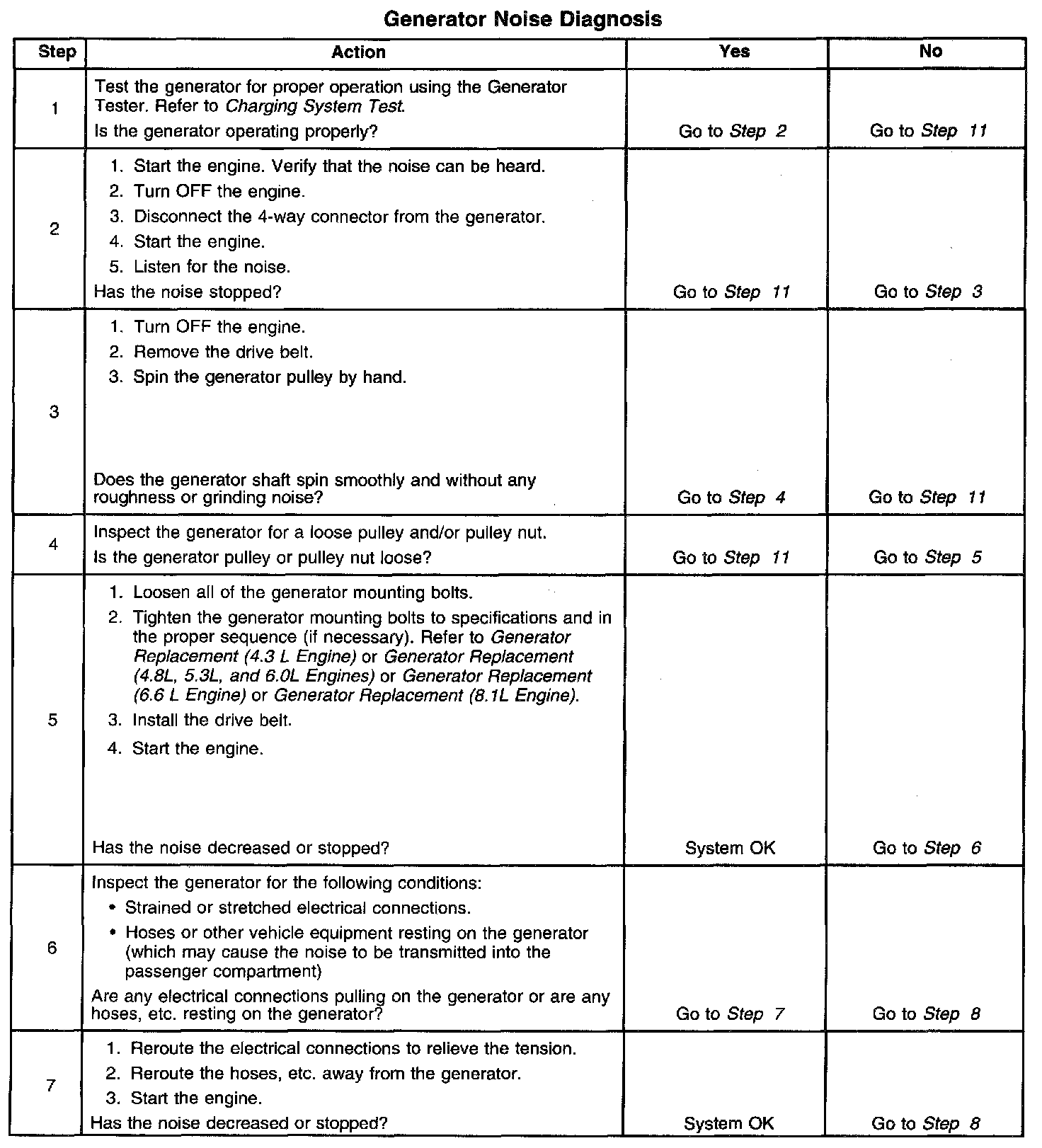 Noise from a generator may be due to electrical or mechanical noise. Electrical noise (magnetic whine) usually varies with the electrical load placed on the generator and is a normal operating characteristic of all generators. When diagnosing a noisy generator, it is important to remember that loose or misaligned components around the generator may transmit the noise into the passenger compartment and that replacing the generator may not solve the problem.