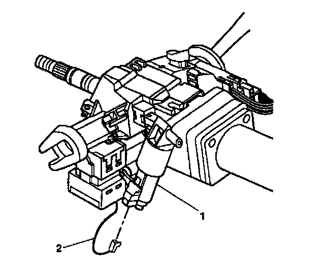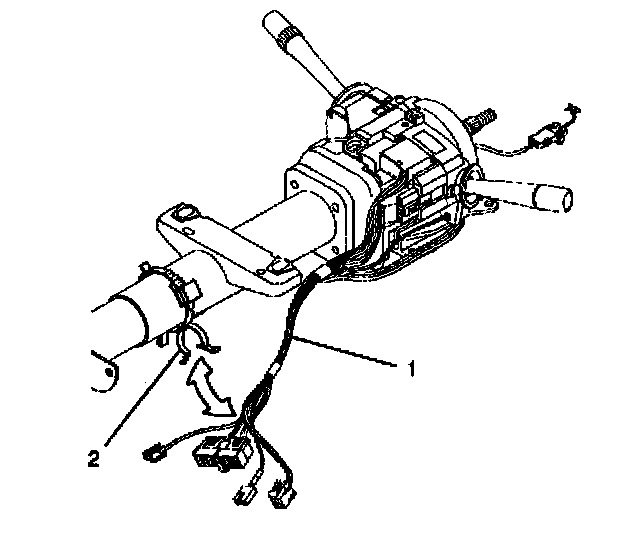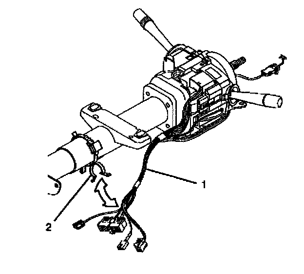 5. Remove the wire harness assembly (1) from the steering column and the wire harness strap (2).