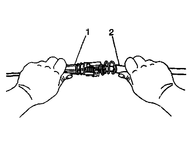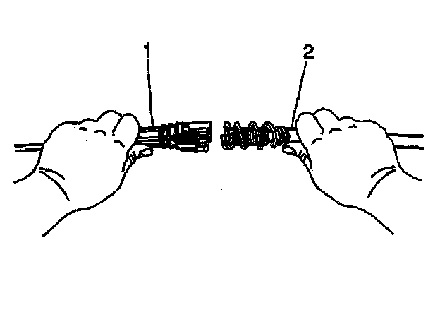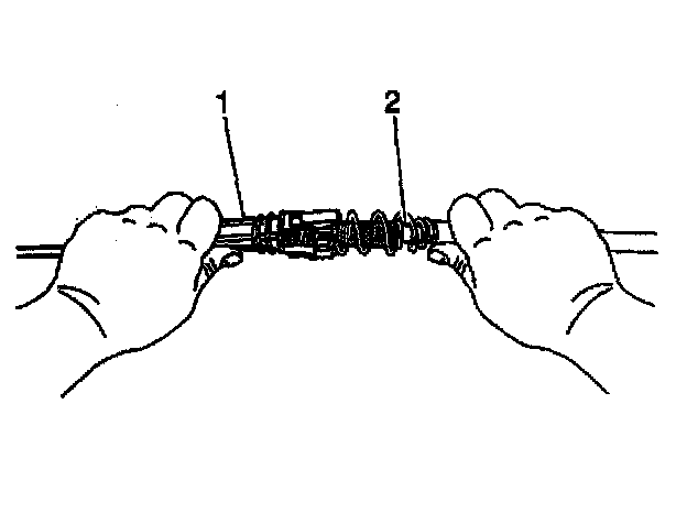 8. Grasp the front half (steering column end) of the transmission cable (1) in the left hand and the rear half (transmission end) of the transmission cable (2) in the right hand.