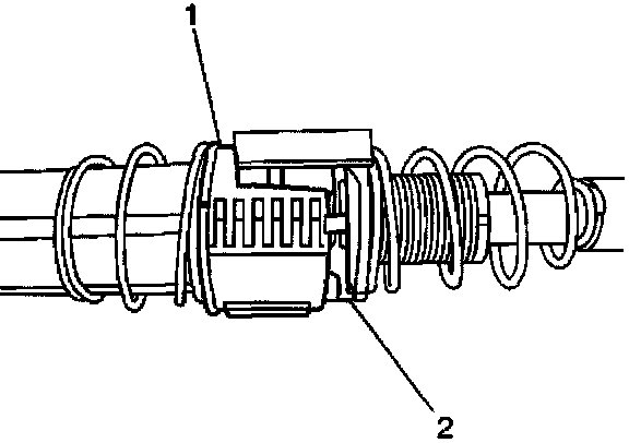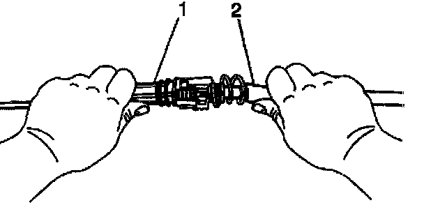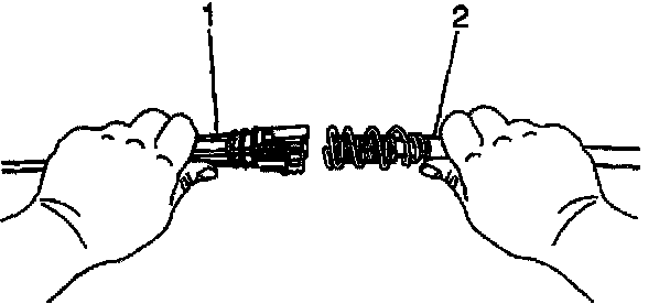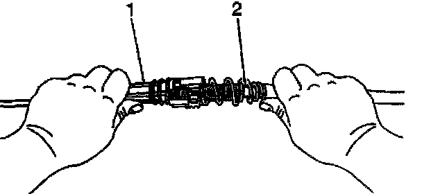 8. Grasp the front half (steering column end) of the transmission cable (1) in the left hand and the rear half (transmission end) of the transmission cable (2) in the right hand.
