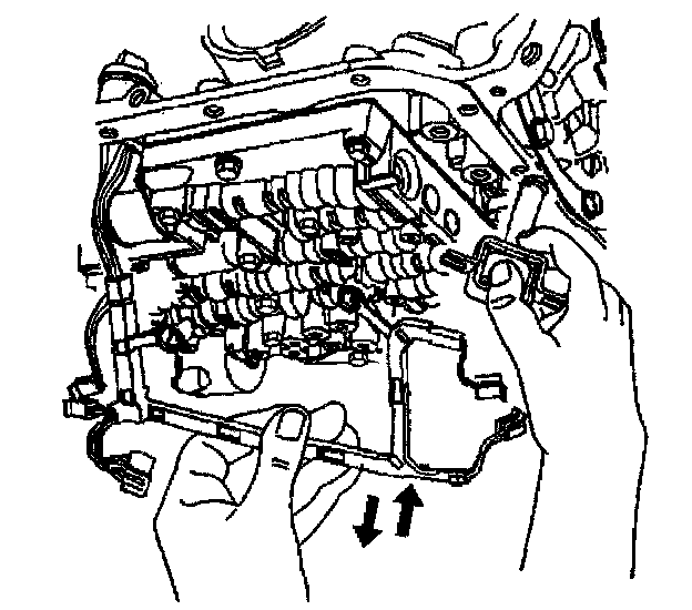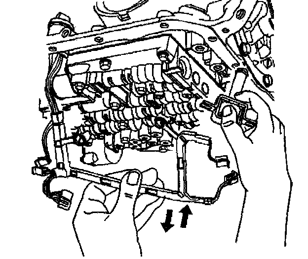 10. Remove the TCC solenoid retaining bolts and the valve body bolts, which retain the internal wiring harness.