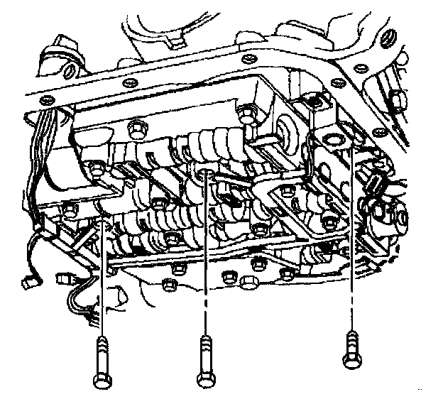 3. Install the valve body bolts, which retain the internal wiring harness and install the TCC solenoid retaining bolts.