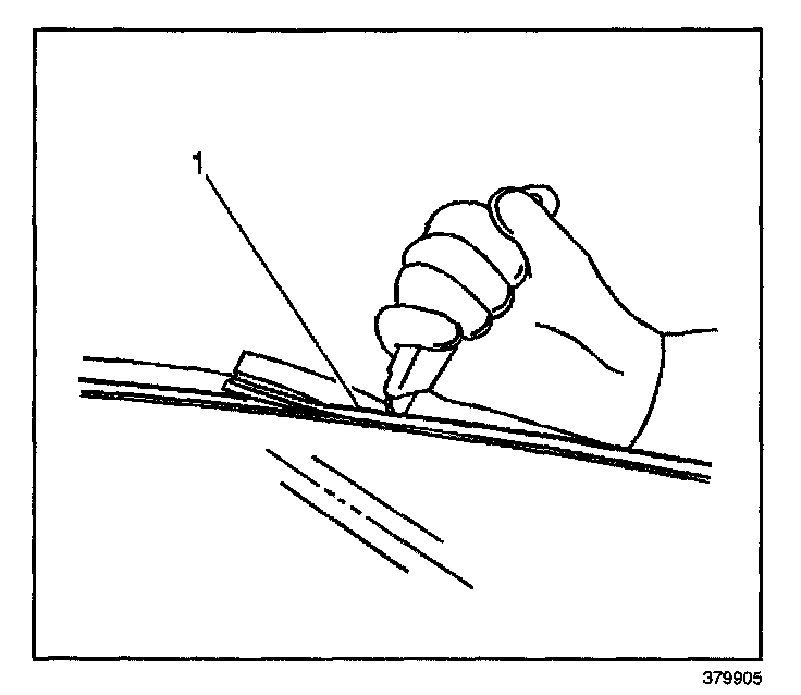 11. Remove the window lower supports (1) by using a flat-bladed tool, lightly prying upward in the middle until the support releases.