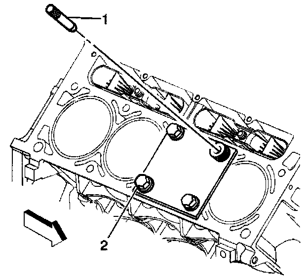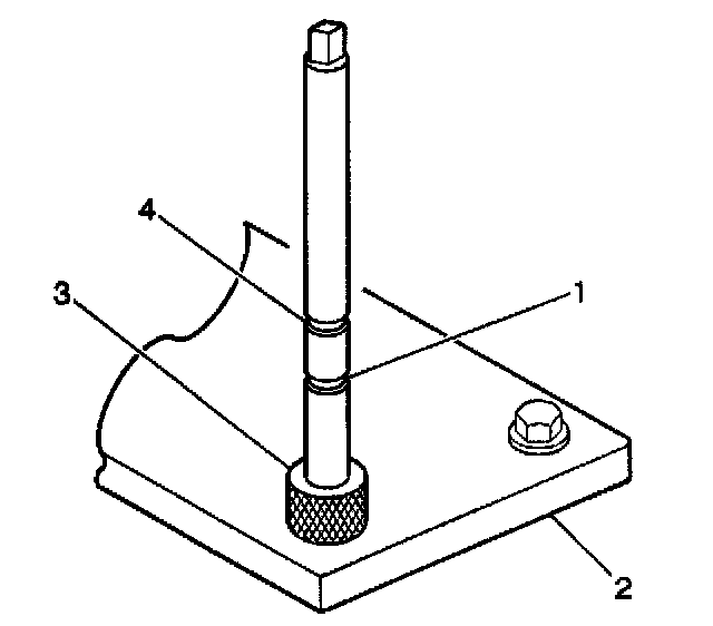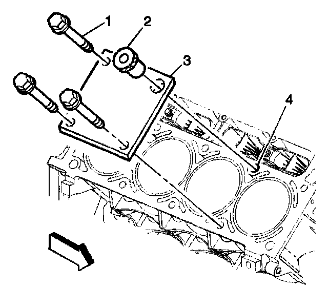 2. Install the fixture plate (3), bolts (1), and bushing (2) onto the engine block deck. Position the fixture plate and bushing over the hole that is to be repaired (4).