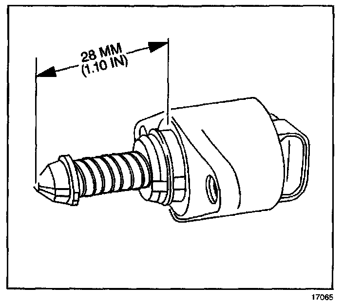 1. Measure the distance between the tip of the IAC valve pintle and the mounting surface (1). If the distance is more than 28 mm (1.1 in) use finger pressure to slowly retract the pintle. The force required to retract the pintle of a new valve does not cause damage to the valve.