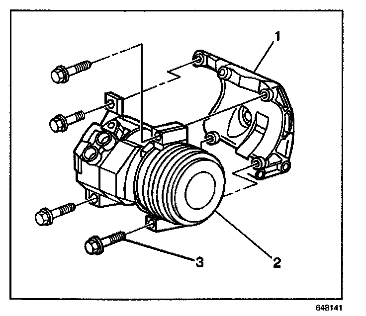 2. Install the A/C compressor (2) to the bracket (1) through the fender well. Insert the mounting bolt (3) into the lower right mounting boss before installing the A/C compressor.