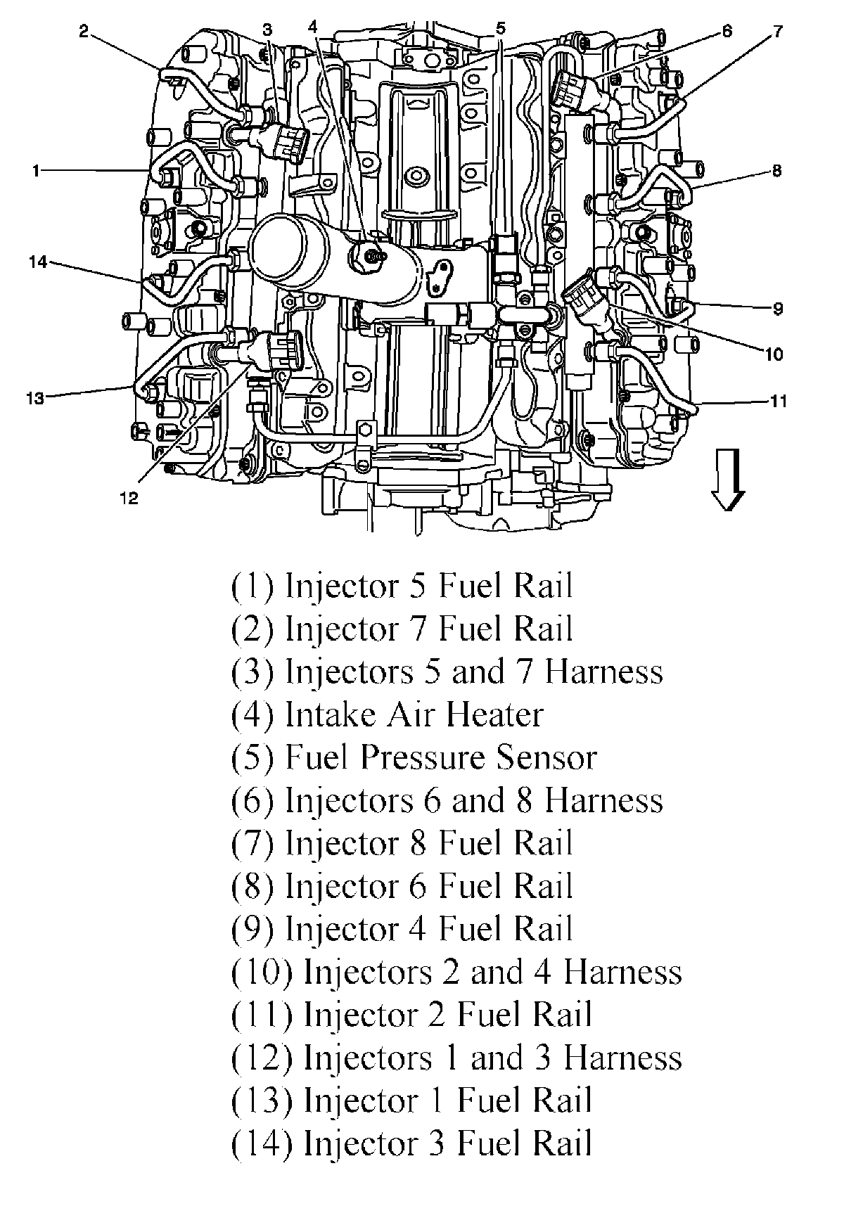 The Fuel Rail Temperature Sensor is attached to the fuel rail, under the upper intake manifold shield.