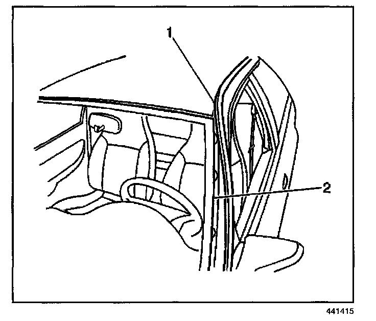 4. Install the front door sealing weatherstrips (1) to the retainer (2).