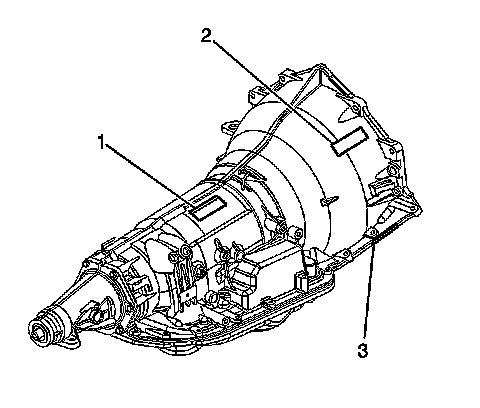 Transmission ID and VIN derivative locations (1, 2). The right hand stamping is shown, left hand is opposite. Pin or hand stamp location (3) for the transmission ID or VIN derivative.