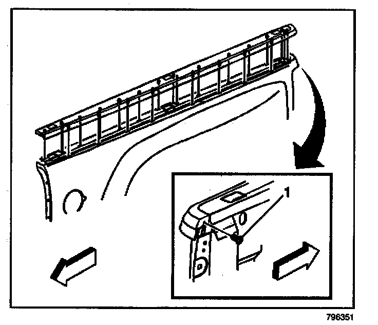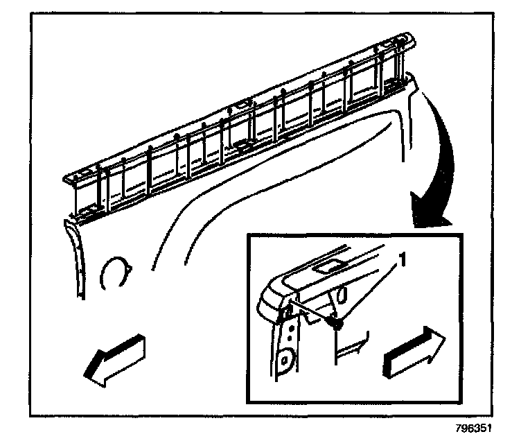 12. Install the upper molding rear retainer (1) to the pickup box side.