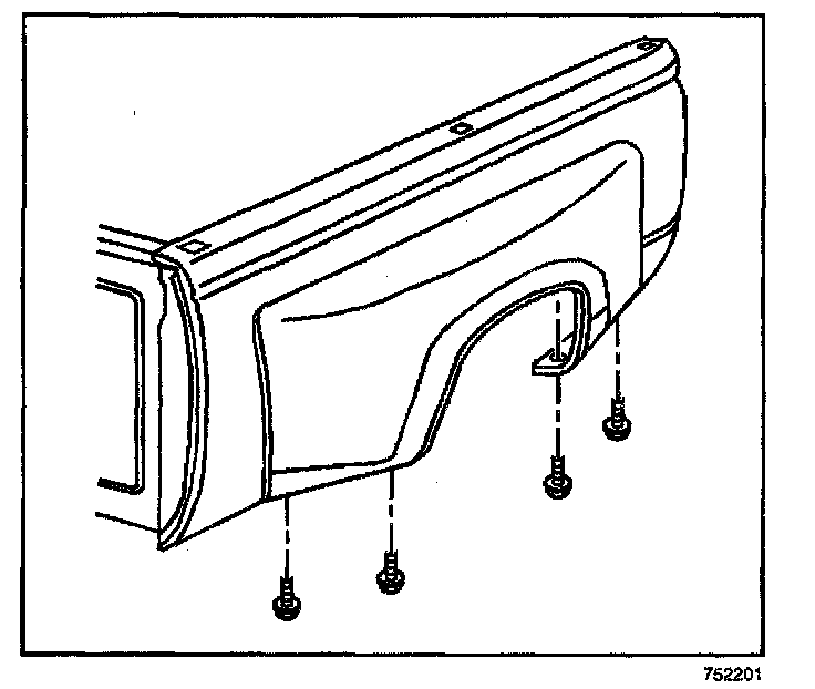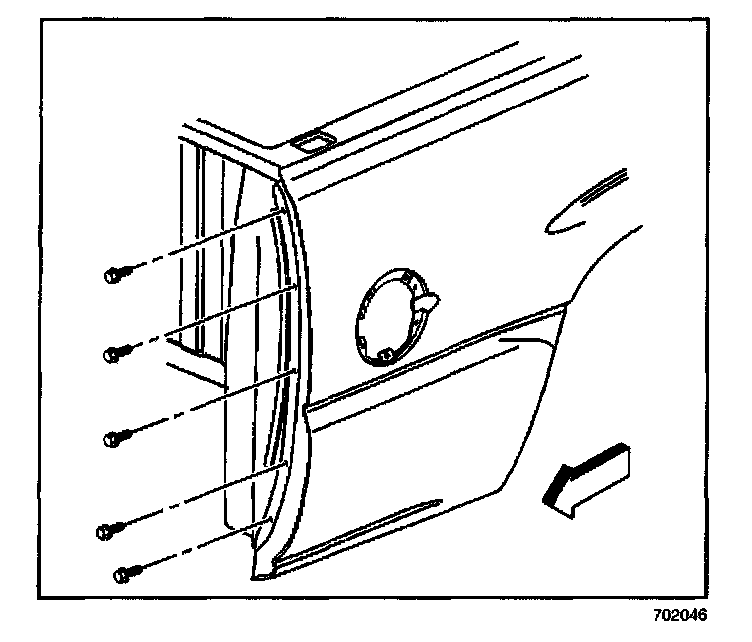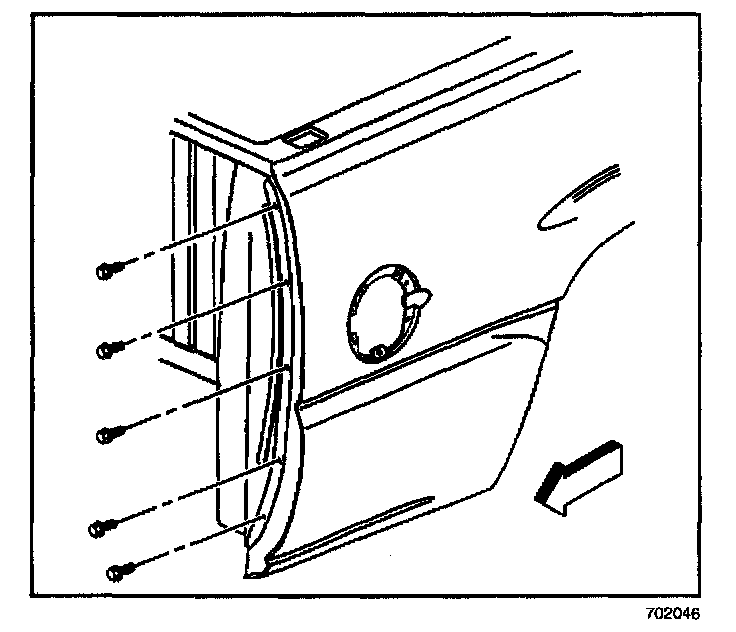 6. Remove the bolts that retain the fender to the rear pillar. Remove the bolts through the taillamp opening.