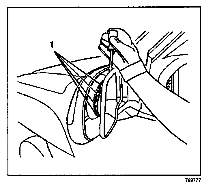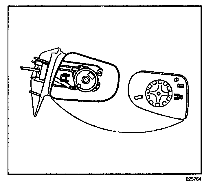 3. With a twisting motion of the flat bladed tool, separate the mirror face from the adjuster mechanism by releasing the mirror face retention clips (1).