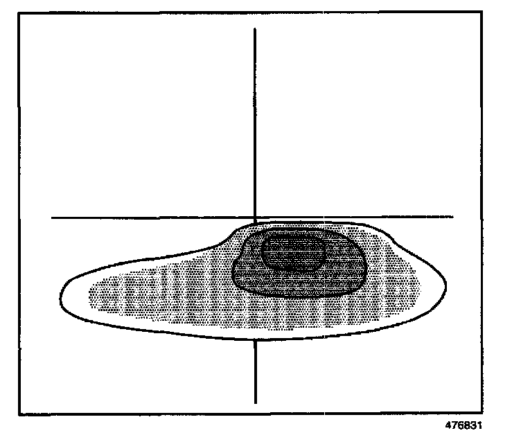 12. Turn on the headlamps to low beam and observe the left and the top edges of the high intensity zone on the screen. The edges of the high intensity zone should fall within the specifications.