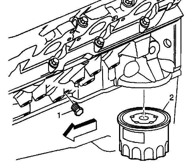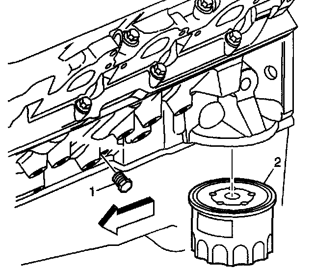 4. Remove the oil filter (2) from the engine block and allow the engine oil to drain completely.