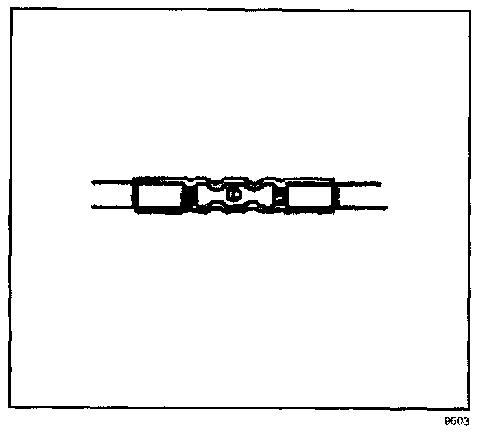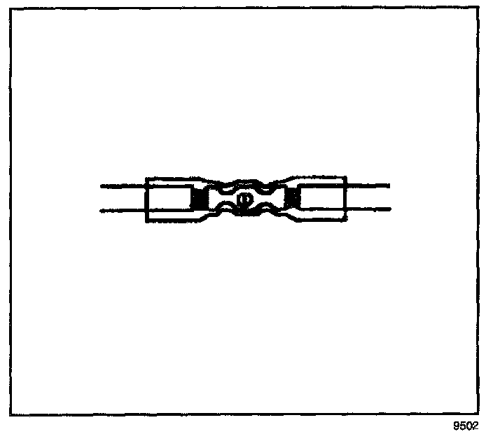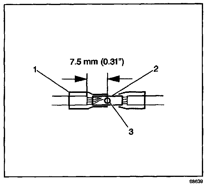 6. Place the splice sleeve in the nest. Ensure that the crimp falls midway between the end of the barrel and the stop. The sleeve has a stop (3) in the middle of the barrel (2) in order to prevent the wire (1) from going further. Close the hand crimper handles slightly in order to firmly hold the splice sleeve in the proper nest.