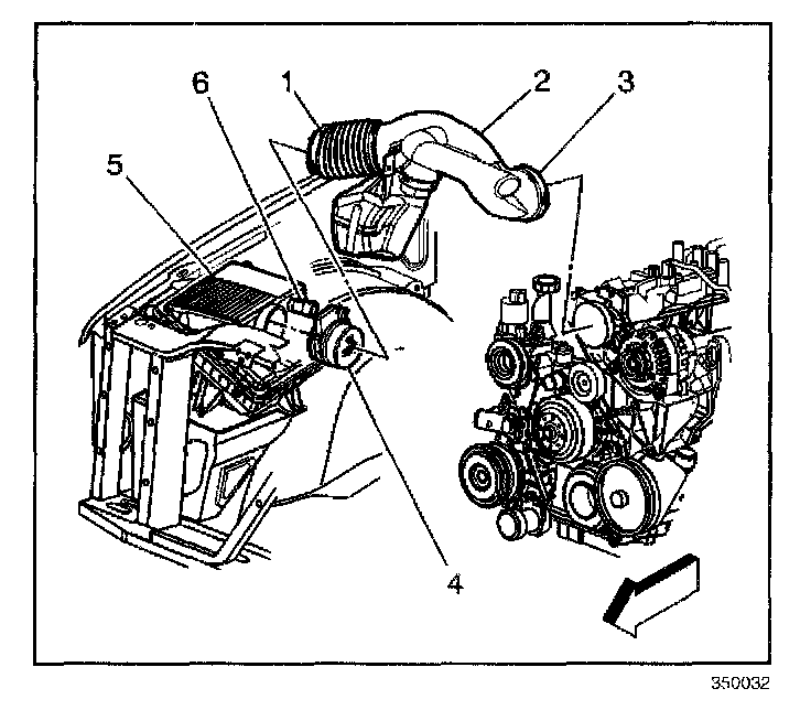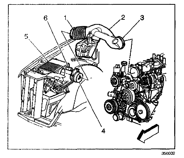 1. Loosen the clamps on the air intake duct (2) at the throttle body (3) and at the mass air flow/intake air temperature (MAF/IAT) sensor (1).