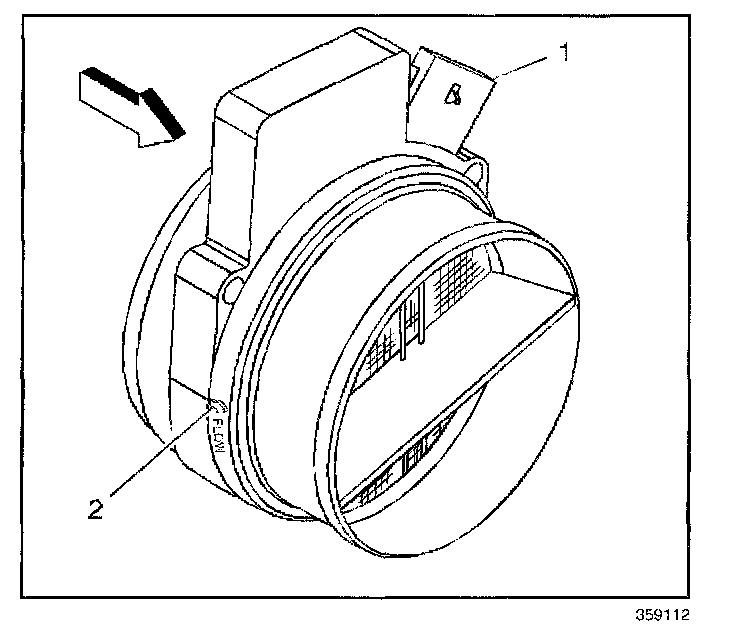 IMPORTANT: If the MAF/IAT sensor is installed backwards, the fuel system goes rich. An arrow (2) cast into the plastic portion of the sensor indicates proper air flow direction. The arrow must point toward the engine.