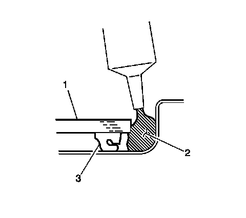 6. Apply a small bead of urethane adhesive (2) between the window (1) and the pinch-weld.