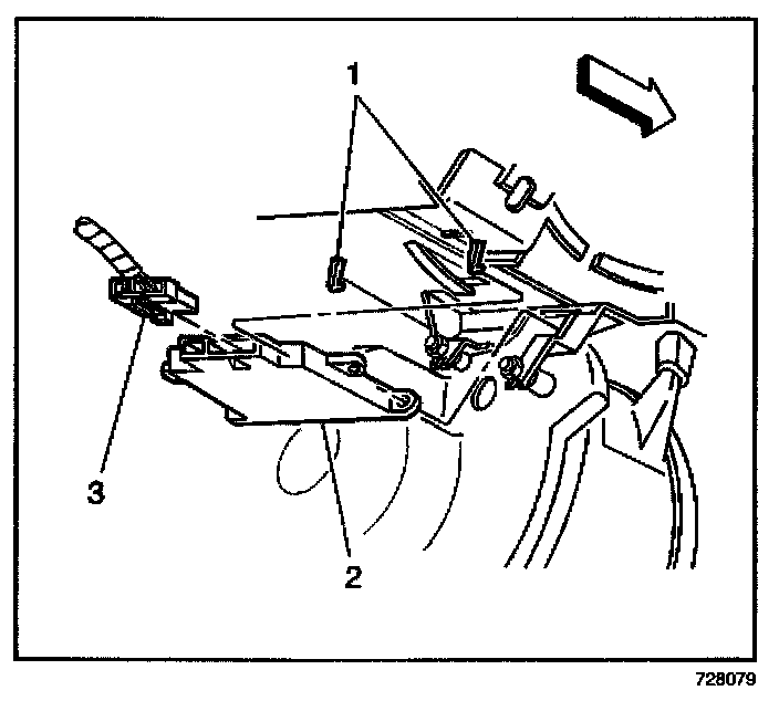 3. Position the VSS module (2) to the instrument panel carrier retaining tabs (1).