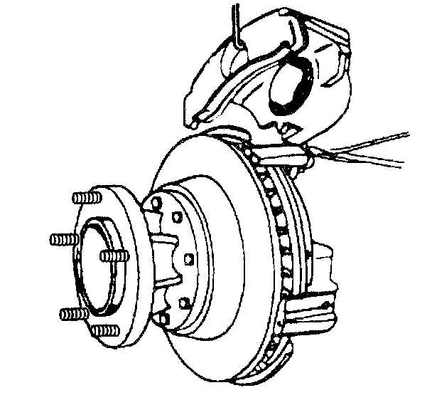 7. Remove the caliper from the mounting bracket and support the caliper with heavy mechanic's wire or equivalent. DO NOT disconnect the hydraulic brake flexible hose from the caliper.