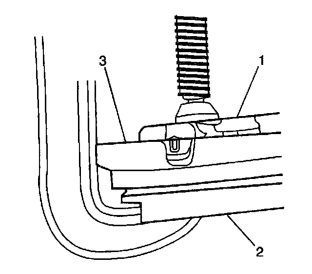 1. Using a C-clamp (1), bottom the piston into the caliper bore (3). Use an old brake pad (2) or wooden block placed across the face of the piston. Do not damage the piston or the caliper boot.