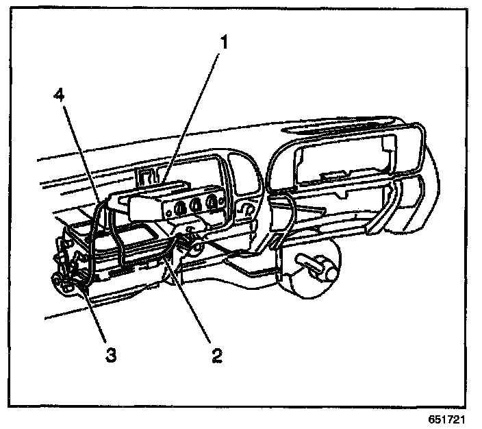 2. Remove the HVAC control assembly (1) by firmly depressing and holding the retaining tabs and then sliding the assembly away from the dash.