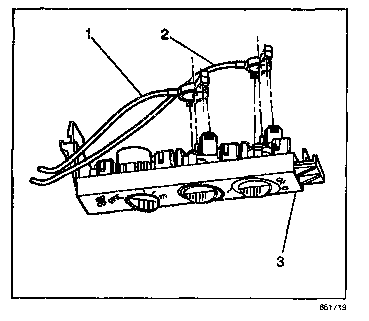 4. Disconnect the temperature cable (1) and mode cable (2) from the back of the HVAC control assembly (3).