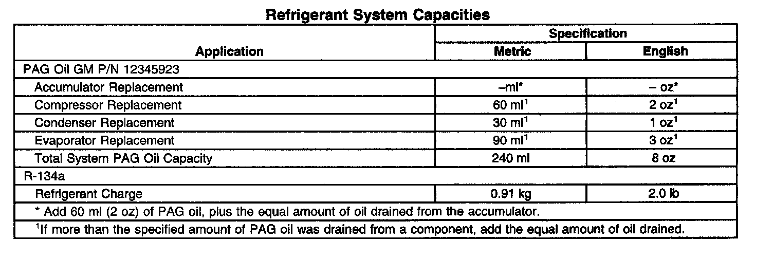 A/C REFRIGERANT SYSTEM OIL CHARGE REPLENISHINGRefrigerant System Capacities: