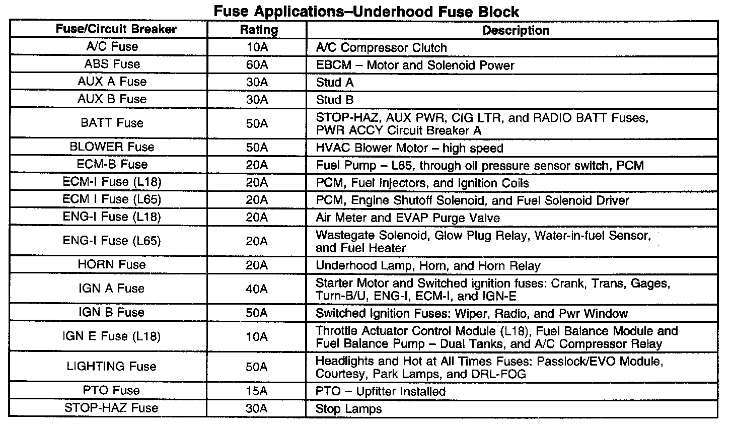 Fuse Applications - Underhood Fuse Block