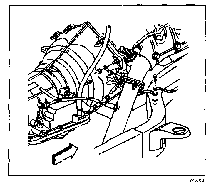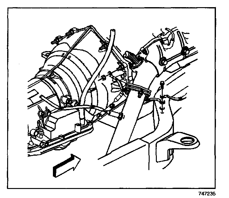 5. Remove the transmission oil fill tube bracket from the engine block stud.