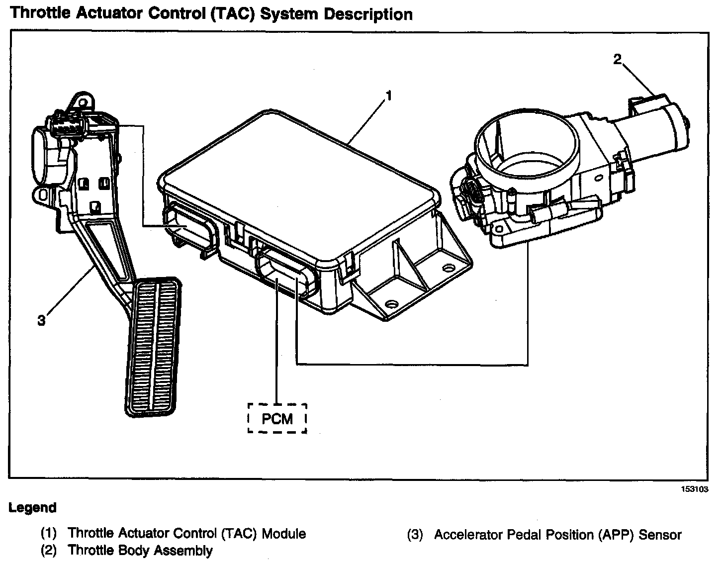 The TAC system uses vehicle electronics and components to calculate and control the position of the throttle blade. This eliminates the need for a mechanical cable attachment from the accelerator pedal to the throttle body. This system also performs the cruise control functions as well.