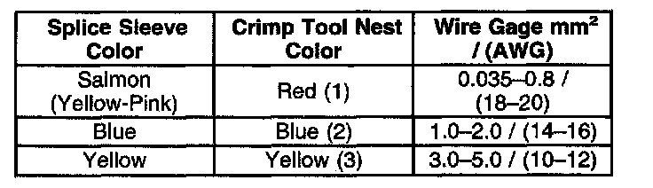 4. Select the proper sealed splice sleeve according to the wire size. Refer to the above table at the beginning of the repair procedure for the color coding of the splice sleeves and the crimp tool nests.
