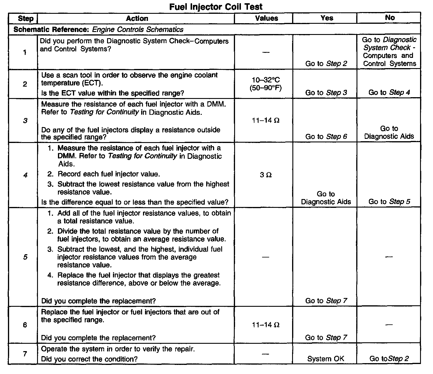 3. This step tests each fuel injector resistance within a specific temperature range. If any of the fuel injectors display a resistance outside of the specified value, replace the fuel injector.