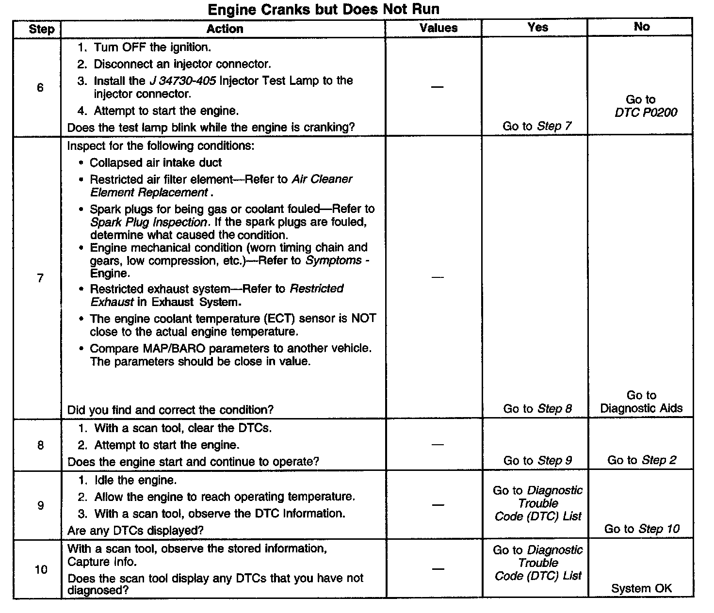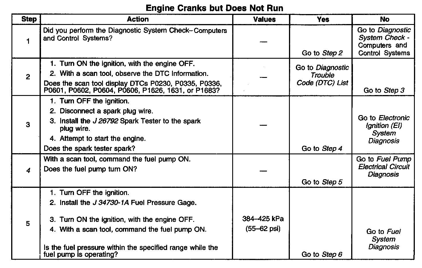 DESCRIPTIONThis diagnostic table is an organized approach to identifying a condition that causes an engine not to start. The Engine Cranks but Does Not Run diagnostic table directs the service technician to the appropriate system diagnosis.