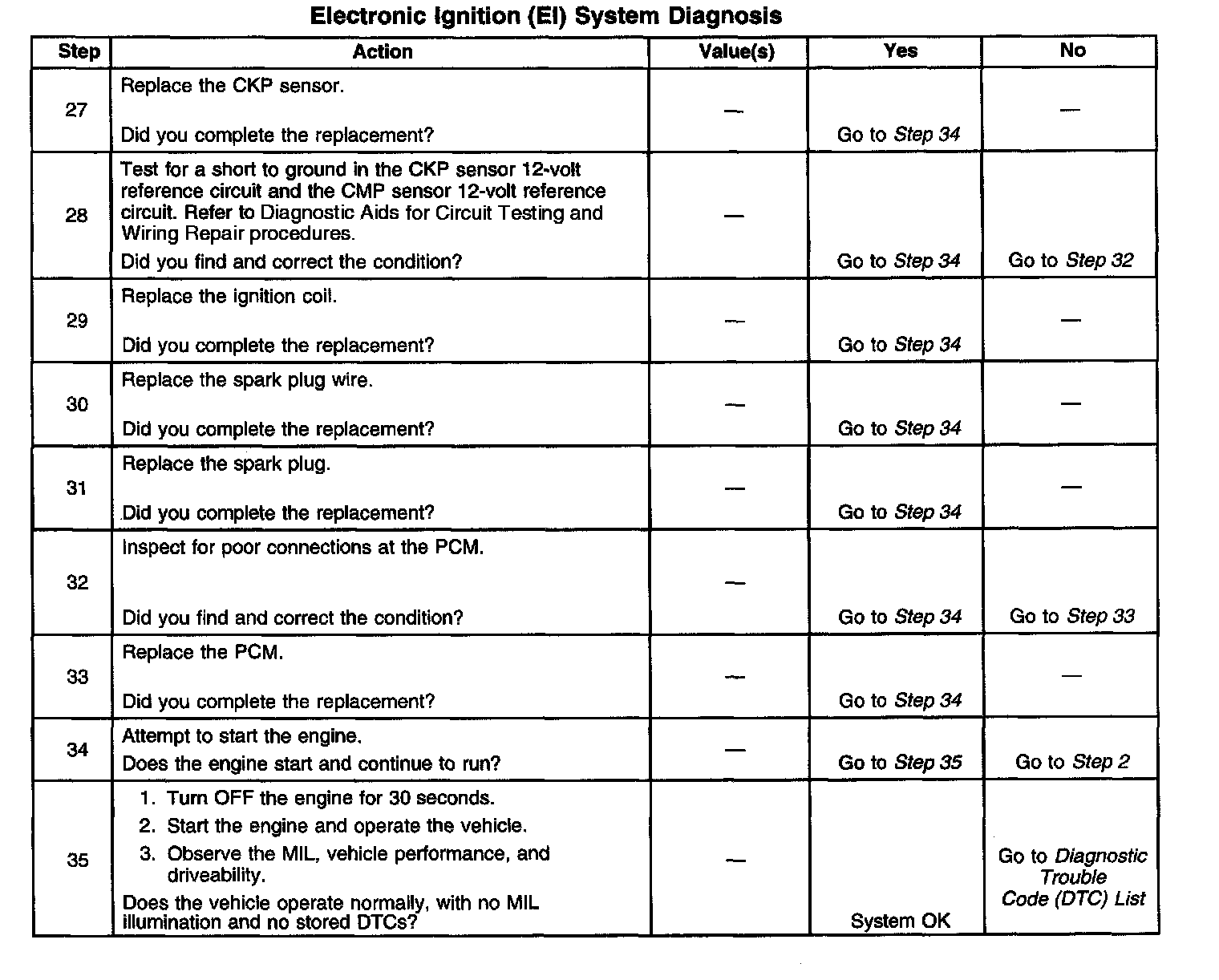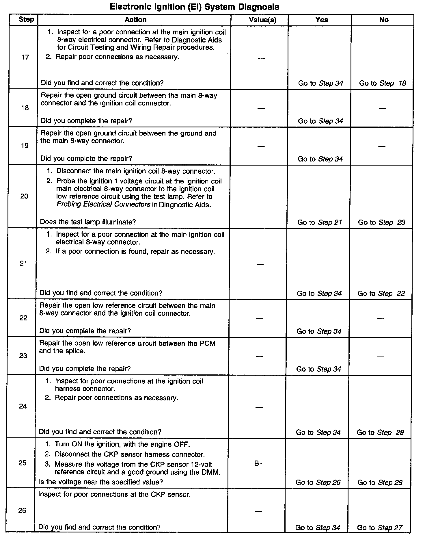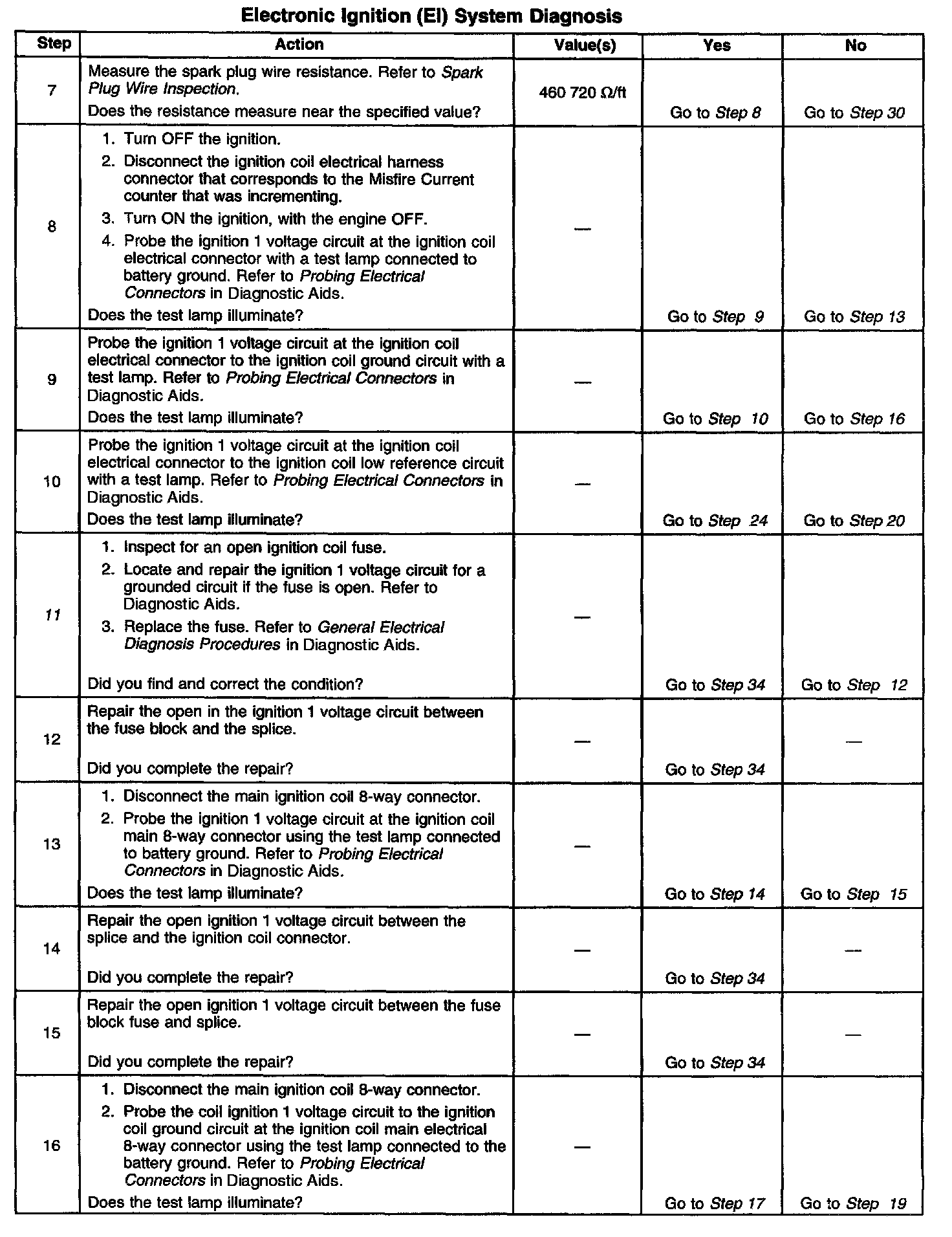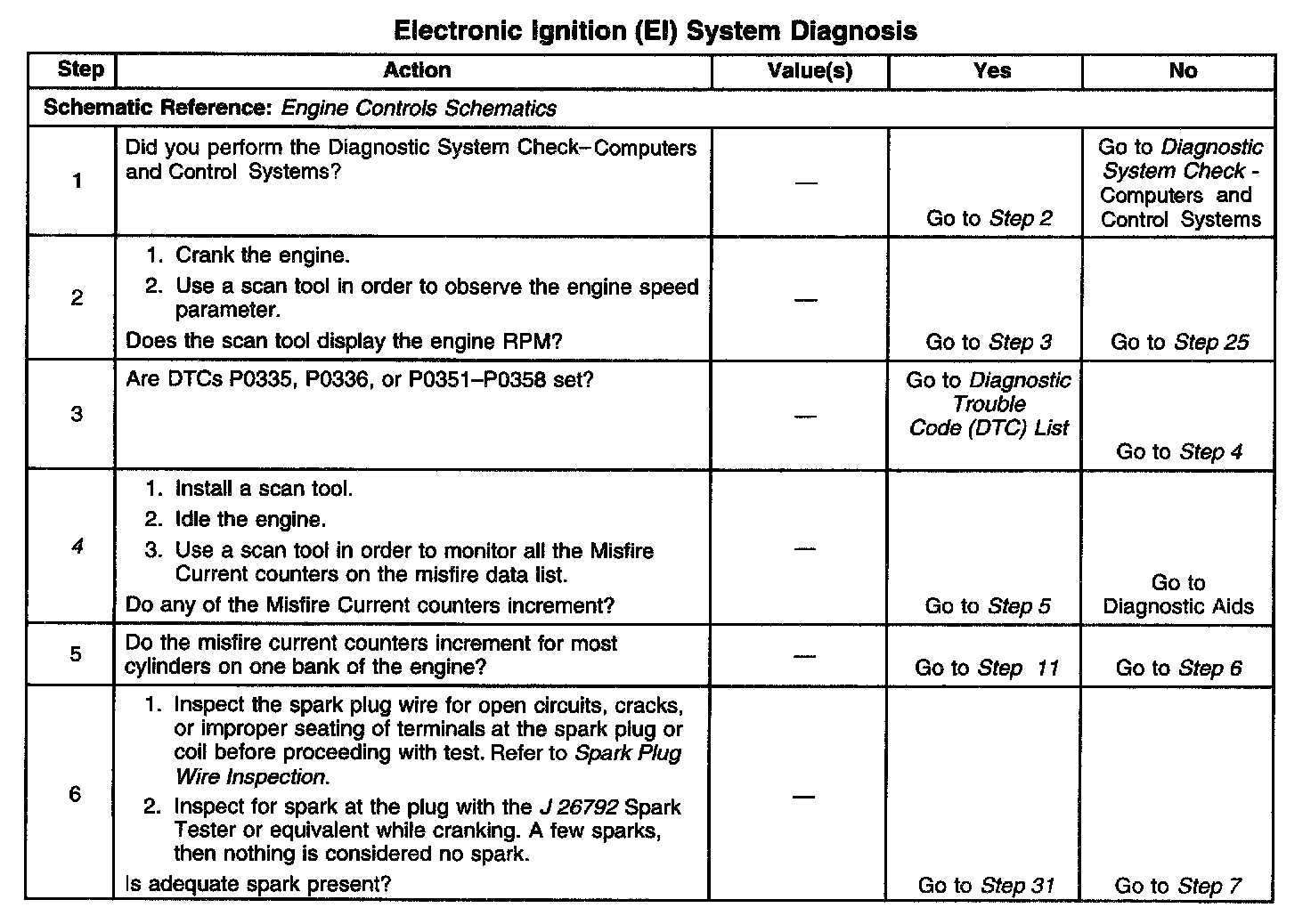 The numbers below refer to the step numbers on the diagnostic table.