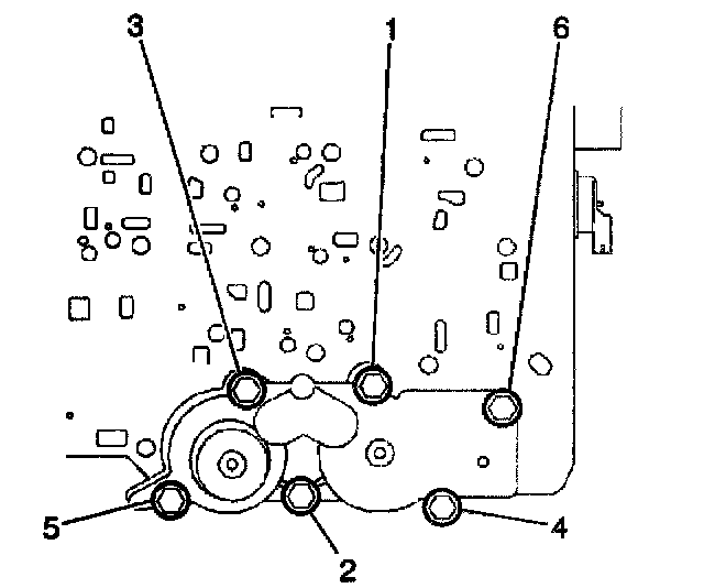 8. Install the six accumulator housing bolts (6). Start the bolts finger tight and work towards the opposite end.