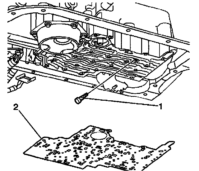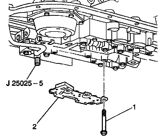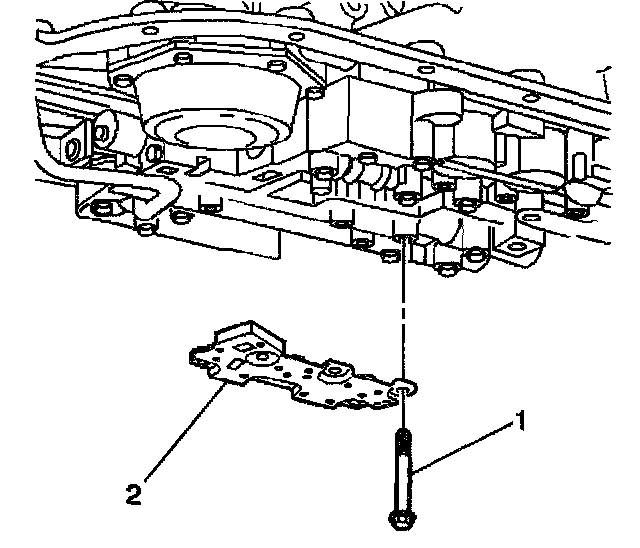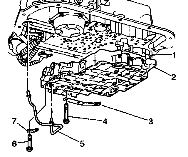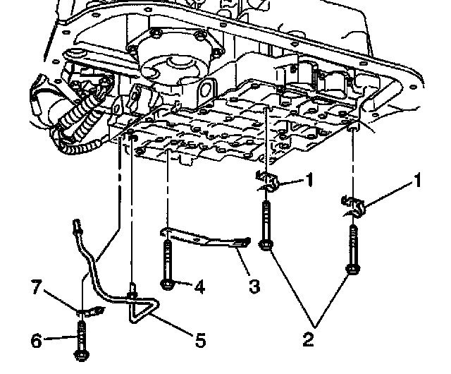 6. Remove the control valve body bolts (1) that retain the (TFP) manual valve position switch (2) to the control valve body.
