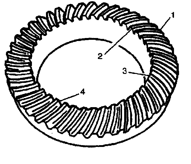 The side of the ring gear tooth which curves outward, or is convex, is the drive side (4). The concave side is the coast side (3). The end of the tooth nearest the center of the ring gear is the toe end (2). The end of the tooth farthest away from the center is the heel end (1).
