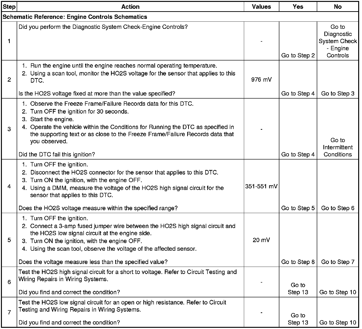 2. When the system is operating correctly, the HO2S 1 voltage should toggle above and below the specified values. You may need to operate the vehicle within the Freeze Frame conditions and Conditions for Setting the DTC in order to duplicate the malfunction that was detected by the PCM.