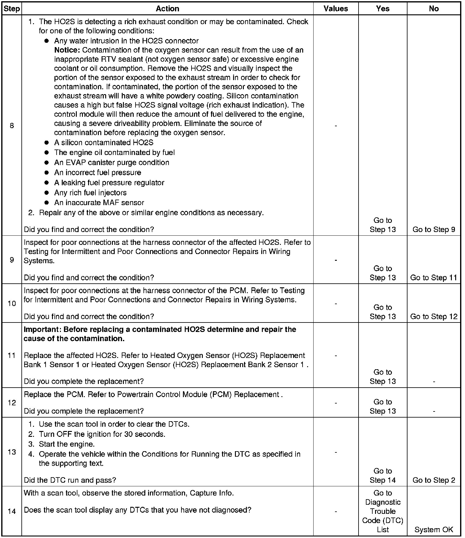 The numbers below refer to the step numbers on the diagnostic table.