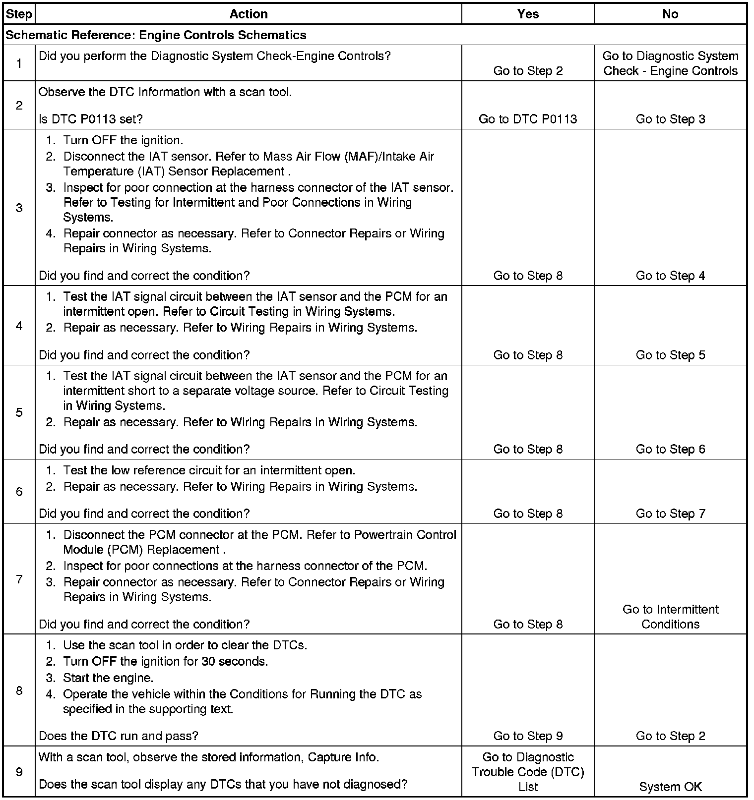 The intake air temperature (IAT) sensor is a variable resistor, sometimes called a thermistor. The IAT sensor has a signal circuit and a low reference circuit. The IAT sensor measures the temperature of the air entering the engine. The powertrain control module (PCM) supplies 5 volts to the IAT signal circuit. When the IAT sensor is cold, the sensor resistance is high. When the air temperature increases, the sensor resistance lowers. With high sensor resistance, the PCM detects a high voltage on the IAT signal circuit. With lower sensor resistance, the PCM detects a lower voltage on the IAT signal circuit. If the PCM detects an intermittent high IAT signal voltage, indicating a low temperature, DTC P1111 sets.