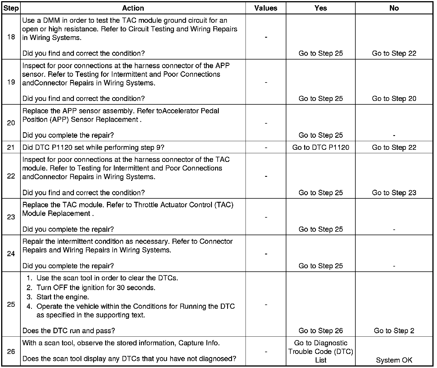 26. When the TAC module detects a condition within the TAC system, more than one TAC system related DTC may set. This is due to the many redundant tests run continuously on this system. Locating and repairing one individual condition may correct more than one DTC. Disconnecting components during testing may set additional DTCs. Keep this in mind when reviewing the stored information, Capture Info.