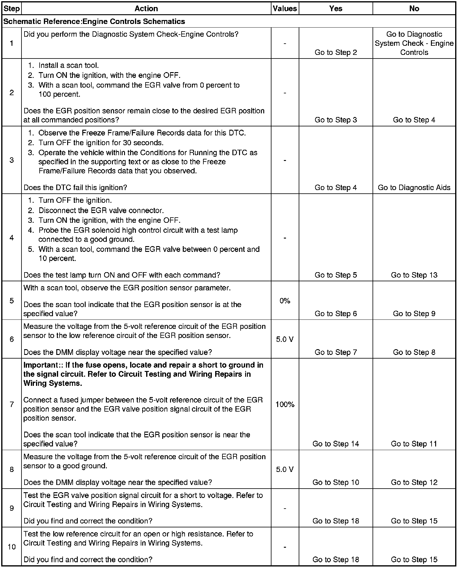 4. When using the scan tool to increment the EGR valve, increment the valve to 10 percent then to 0 percent. Repeat this process to see if the test lamp turns ON then OFF. If the test lamp does not turn OFF when the EGR valve is commanded to 0 percent, the EGR solenoid high control circuit is shorted to voltage.